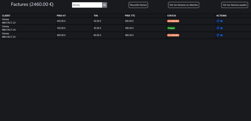 Dans cet exemple, la barre de recherche est utilisée sur des factures et plus précisément sur le nom de la compagnie à qui appartient la facture.