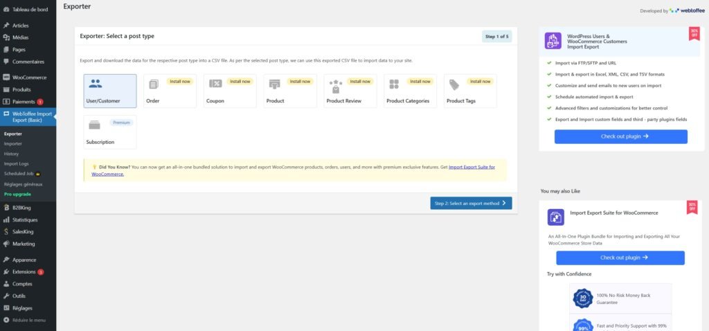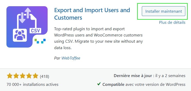 Pour exporter les mails de tous les utilisateurs d’un site WordPress, nous allons utiliser un plugin : Export and Import Users and Customers développé par WebToffee. Le plugin est disponible dans une version payante mais nous n’avons besoin que de la version gratuite.
