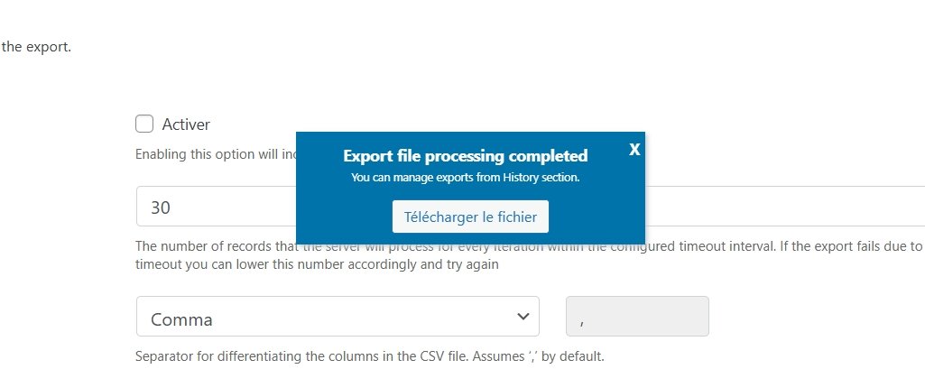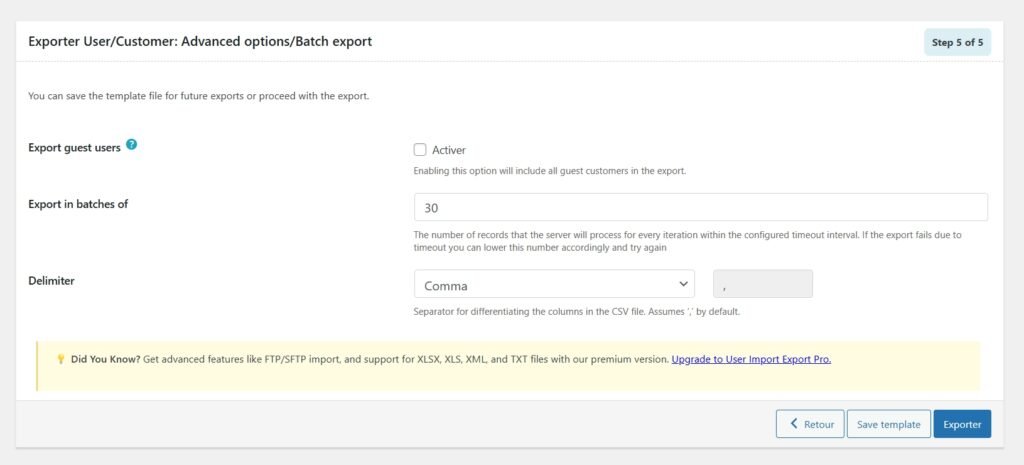 Ici, vous pouvez laisser les parametres de base, cependant, si vous avez un grand nombre d’utilisateurs, je vous recommande d’augmenter « Export in batches of » pour avoir plus d’utilisateurs par fichier. Vous pouvez cliquer sur Exporter