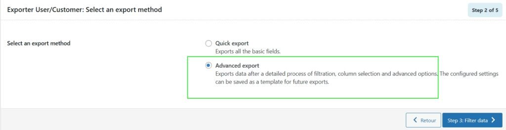 Sélectionnez Advanced Export puis, cliquez sur « Step 3 : Filter Data »